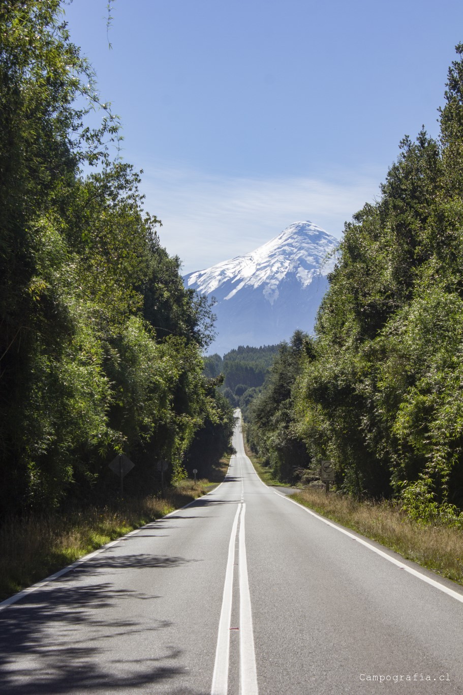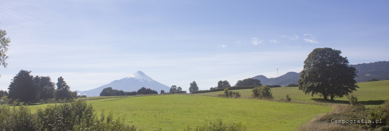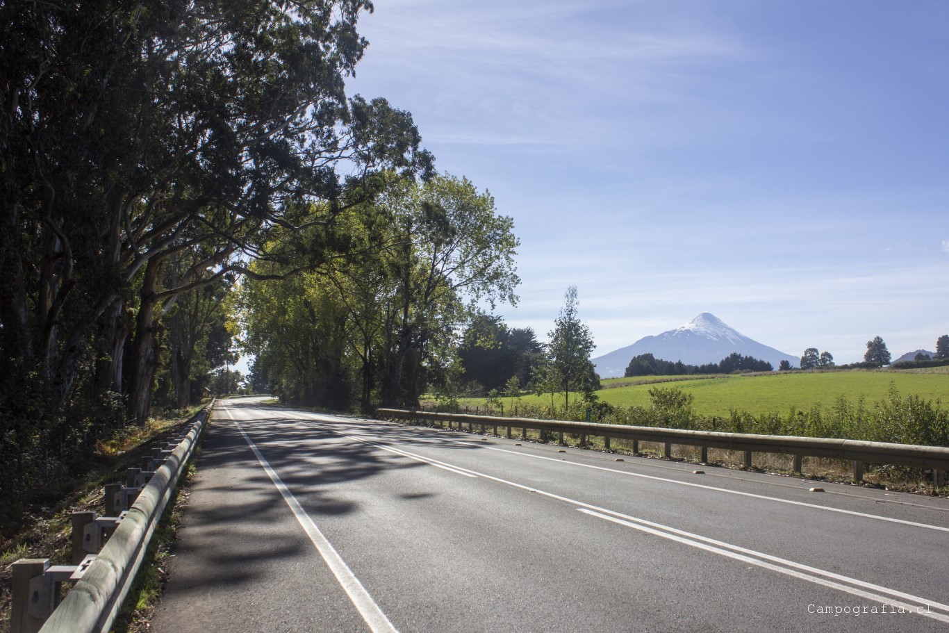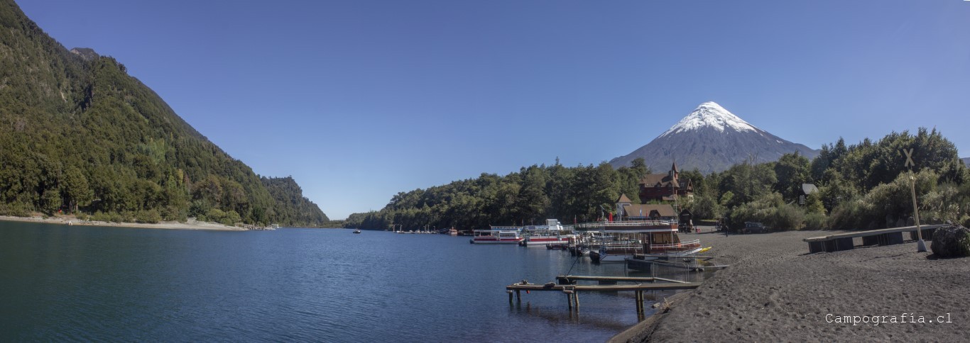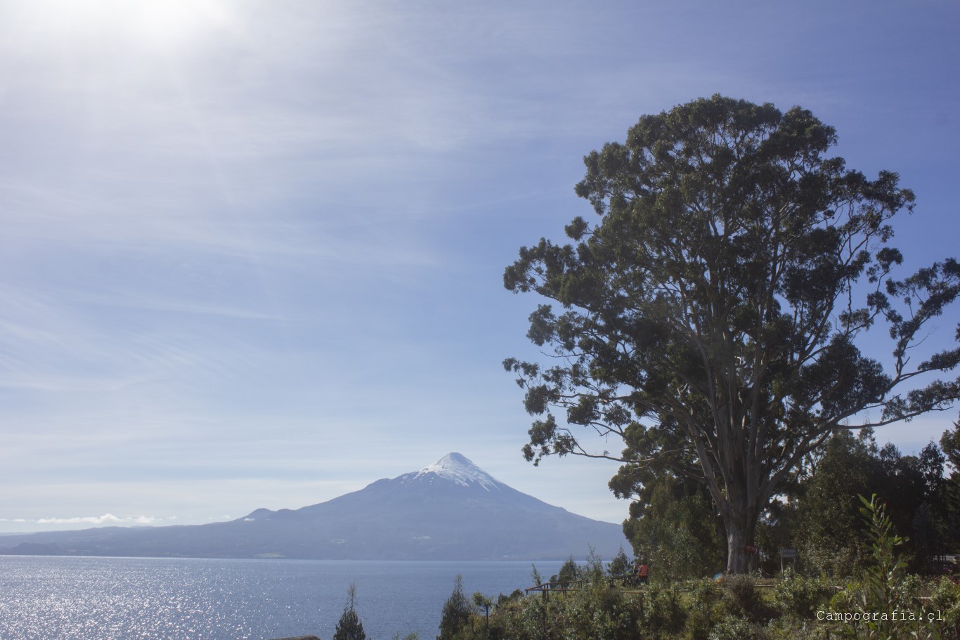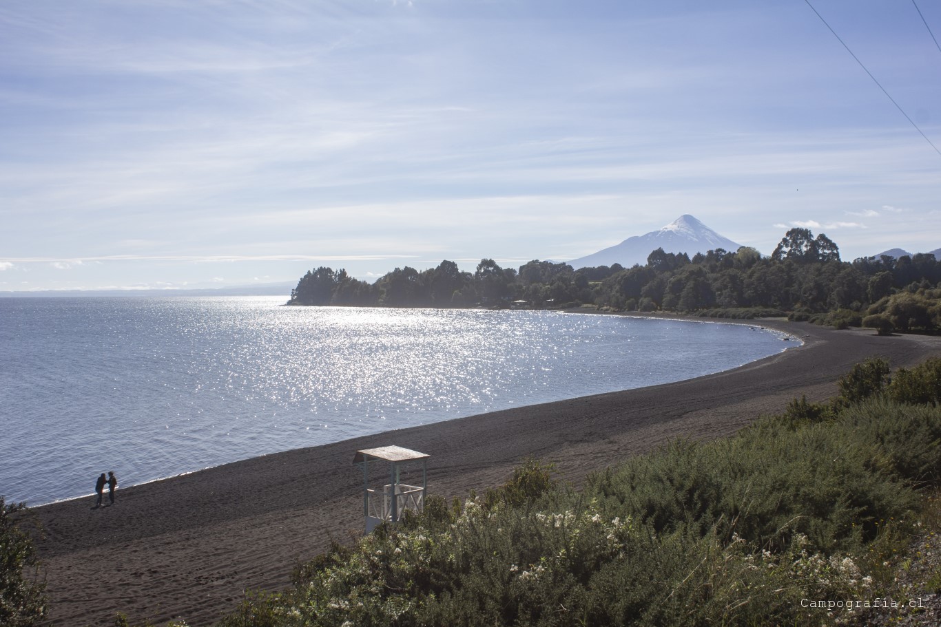 Bordeando el Lago Llanquihue. El volcán Osorno acapara la vista de todo paisaje.