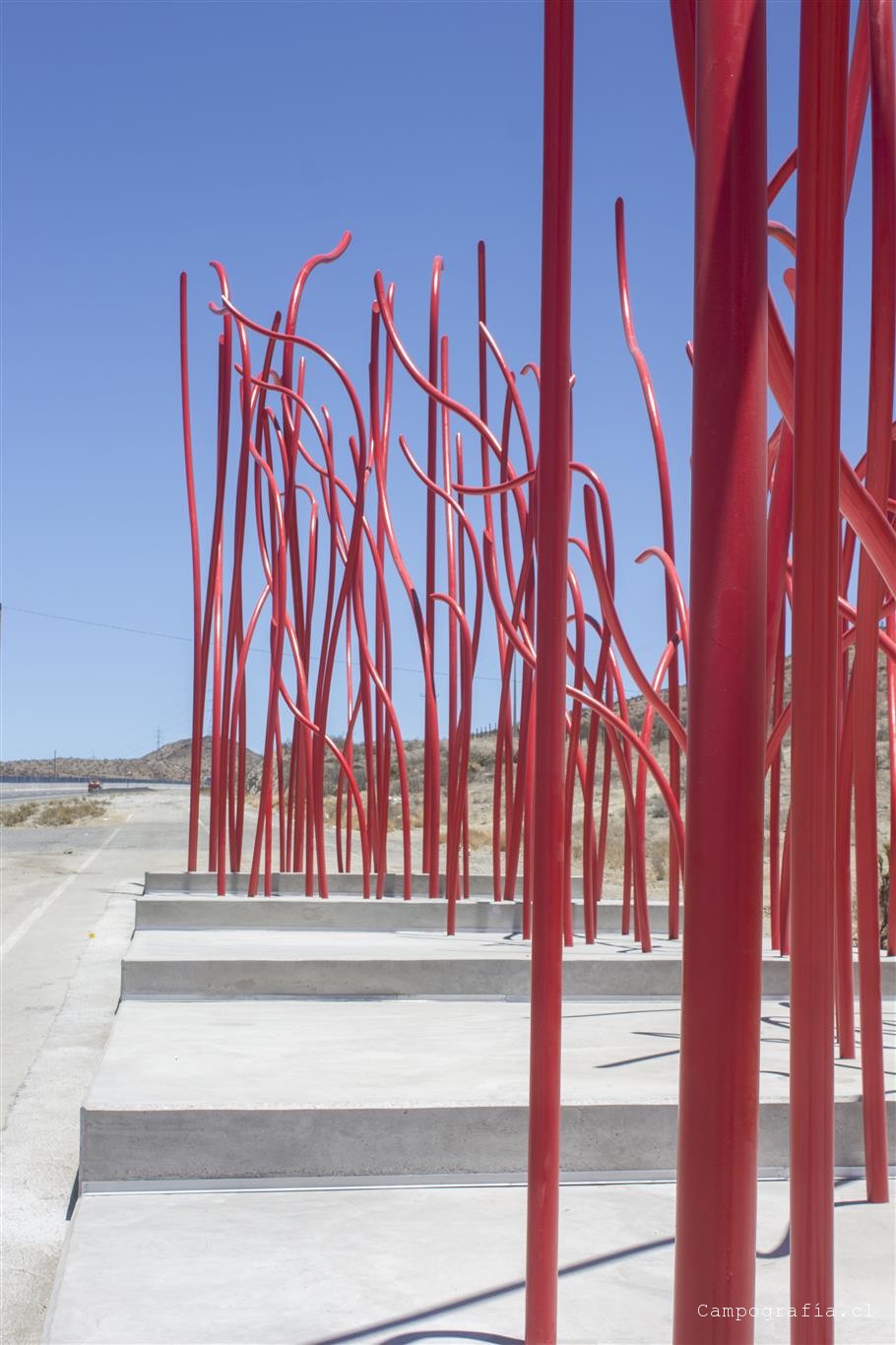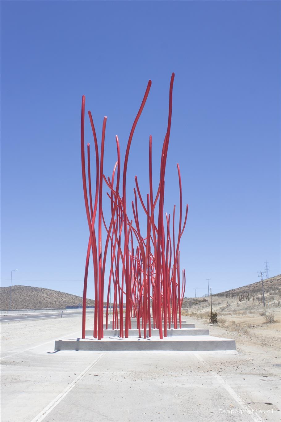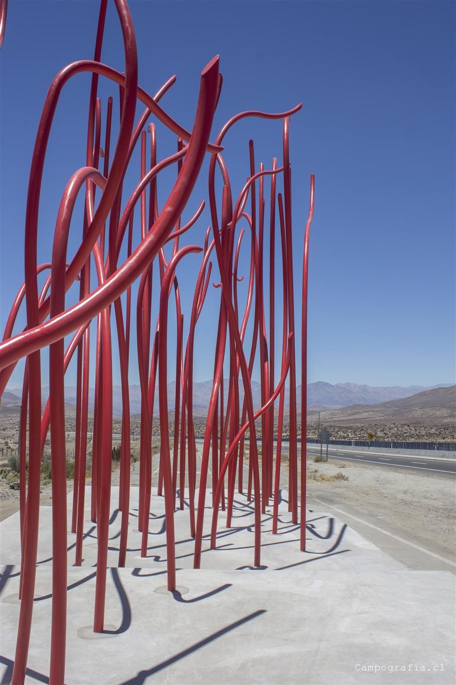 Unos kilómetros mas nos topamos con una escultura de tubos rojos al costado poniente de la ruta. Realmente te deja plop. Varias personas pararon en ese rato tambien.