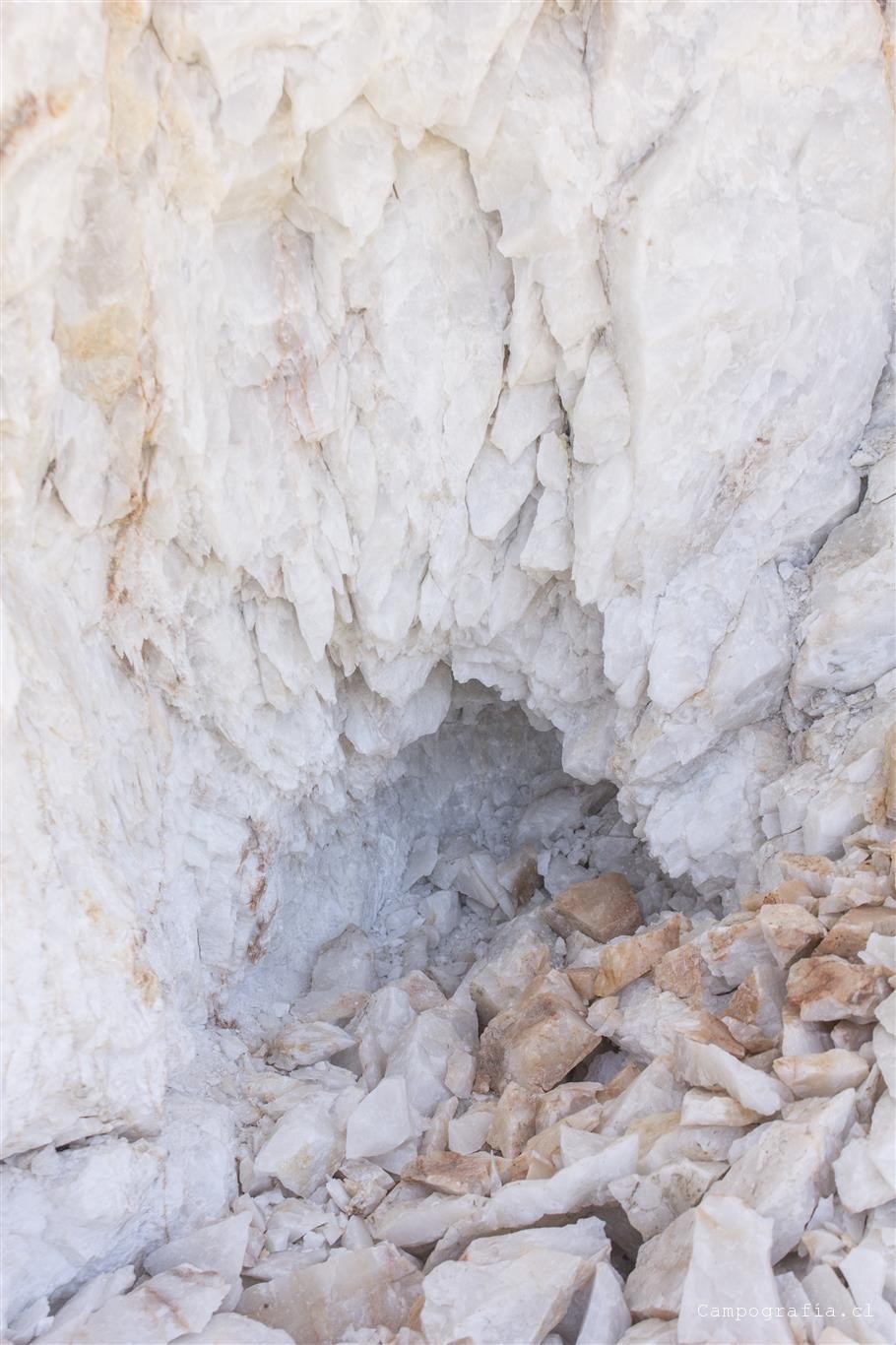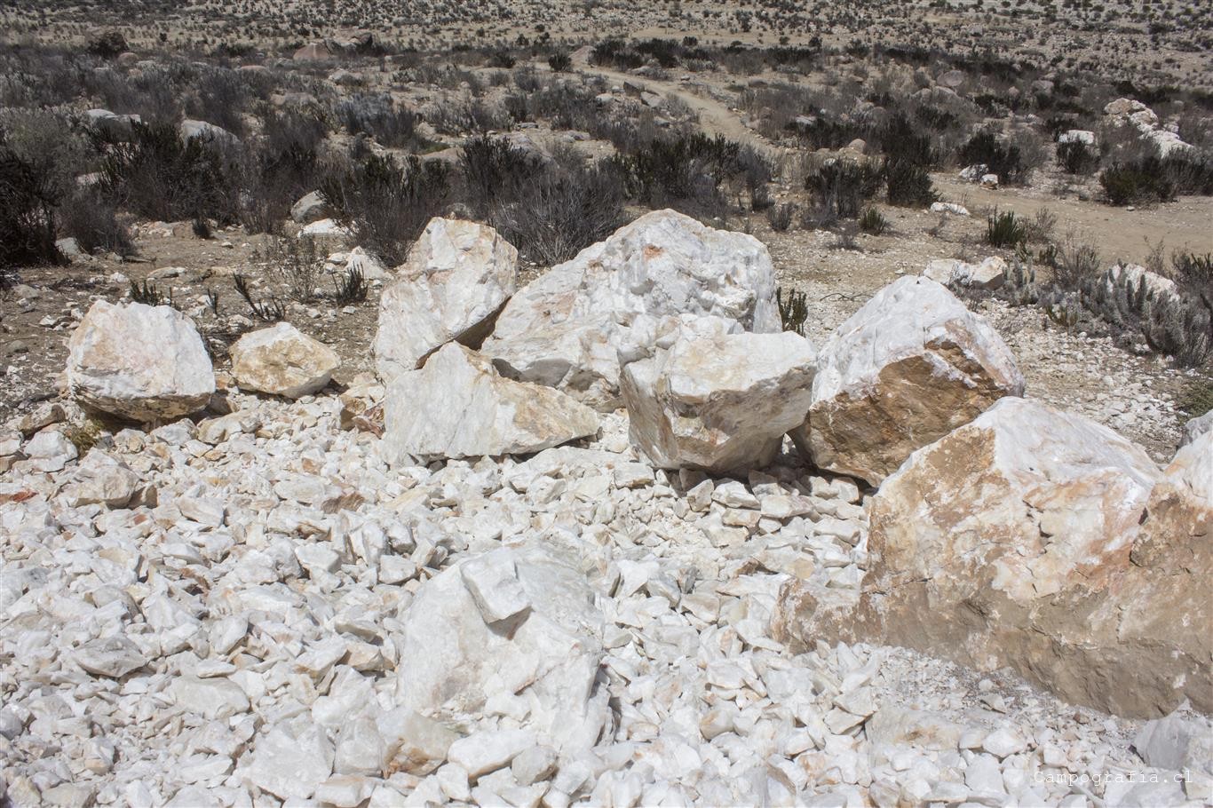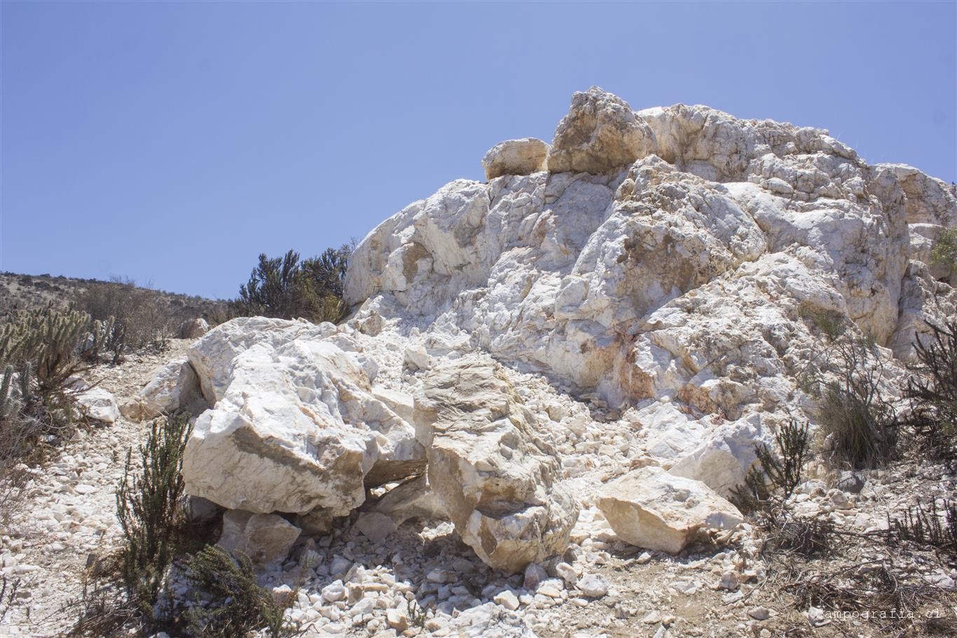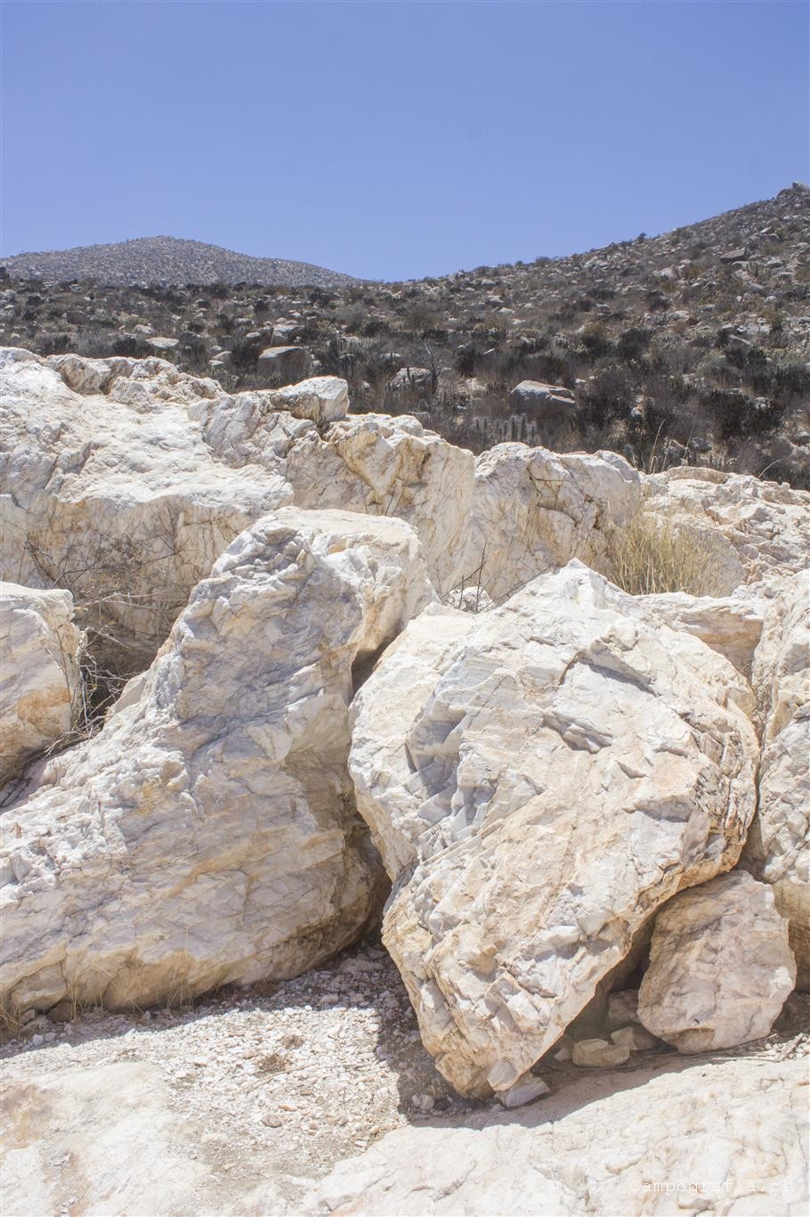 Seguimos adelante por la cuesta Las Totoras, y pasando por Sauce Perez, donde anunciaban un camping, llegamos a la orilla de un cerro de donde se asoma una veta de cuarzo blanco. Es increible ver ese pedazo gigante de cuarzo saliendo del cerro.