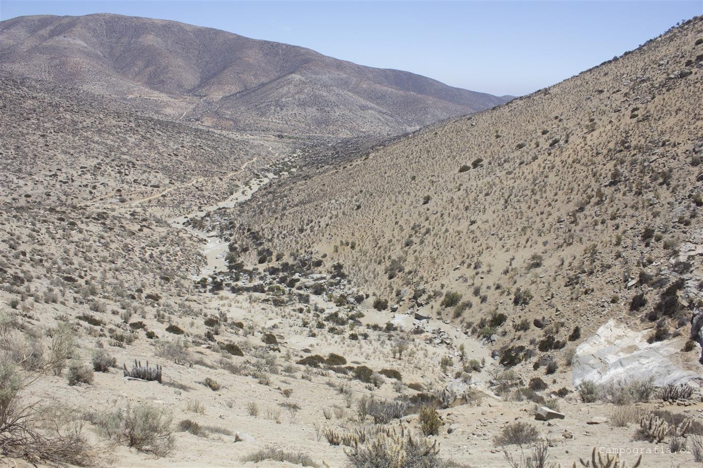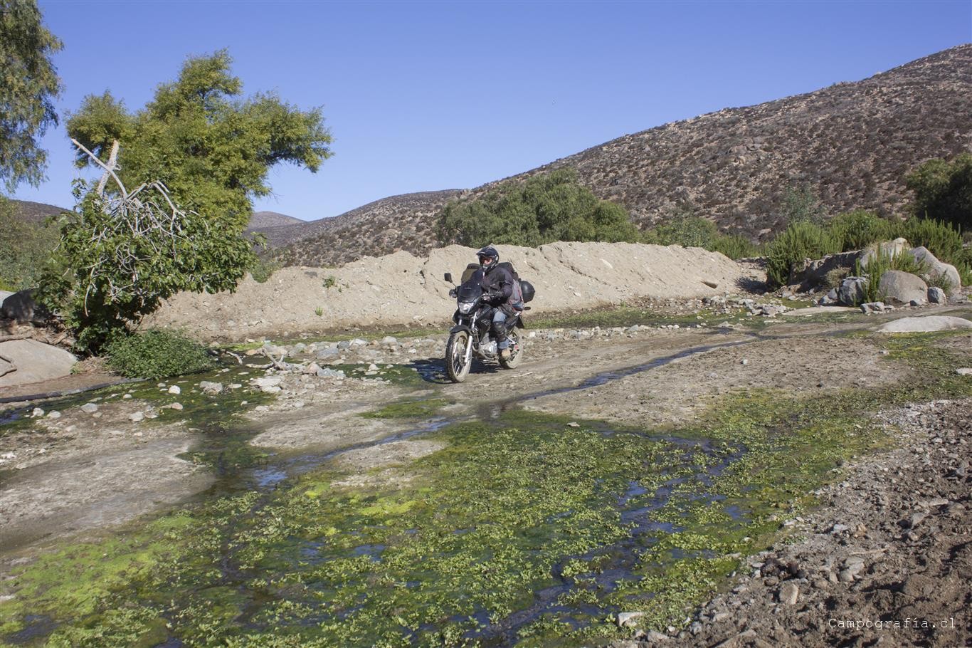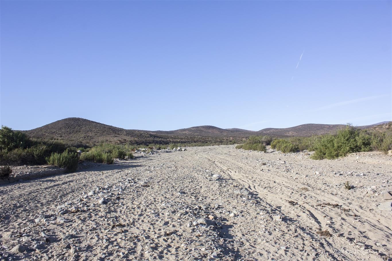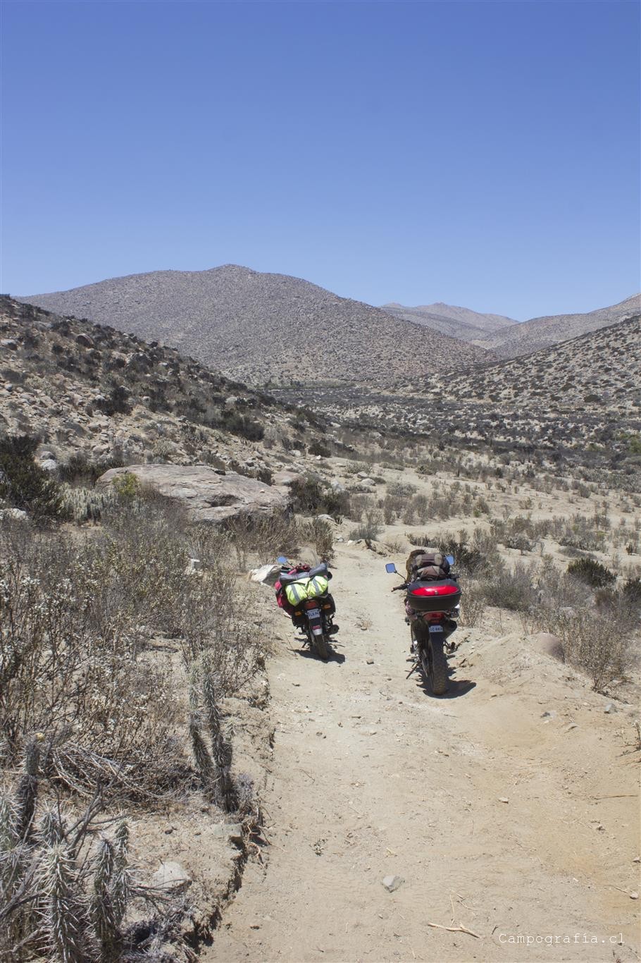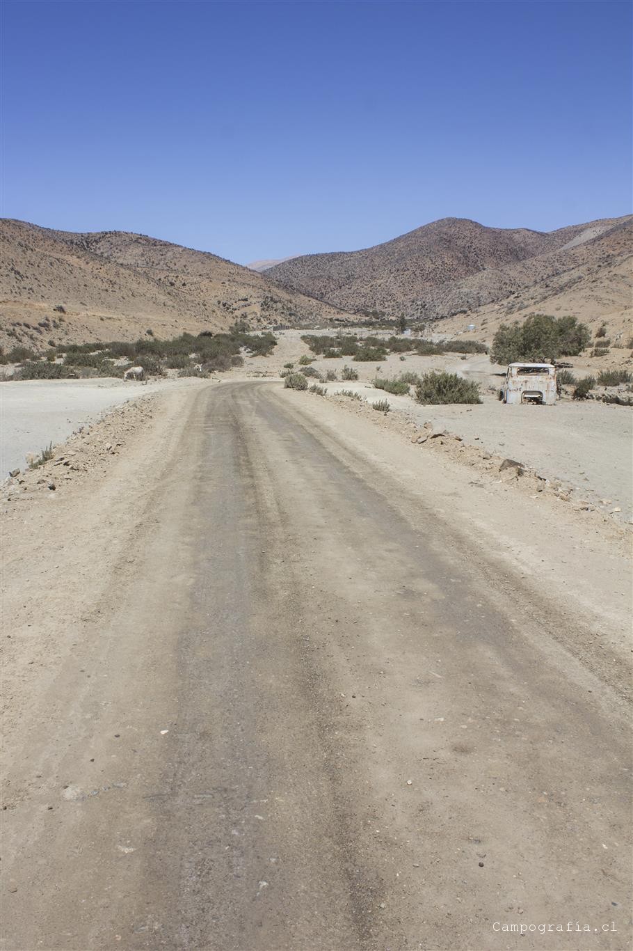 Bueno, aqui el camino en teoria termina y la gente normal se devuelve. Pero nosotros habiamos visto que el camino seguía y, viendo una huella de camioneta, seguimos este camino… cuando de repente nos dimos cuenta que estabamos andando por el lecho de un rio, lleno de arena. No podíamos ir a mas de 5 por hora sin caernos…. Asi anduvimos 2 horas y avanzamos unos 10 km, donde el cansancio y la hora nos hizo acampar. Un camino donde en cada vuelta queríamos que se terminara…