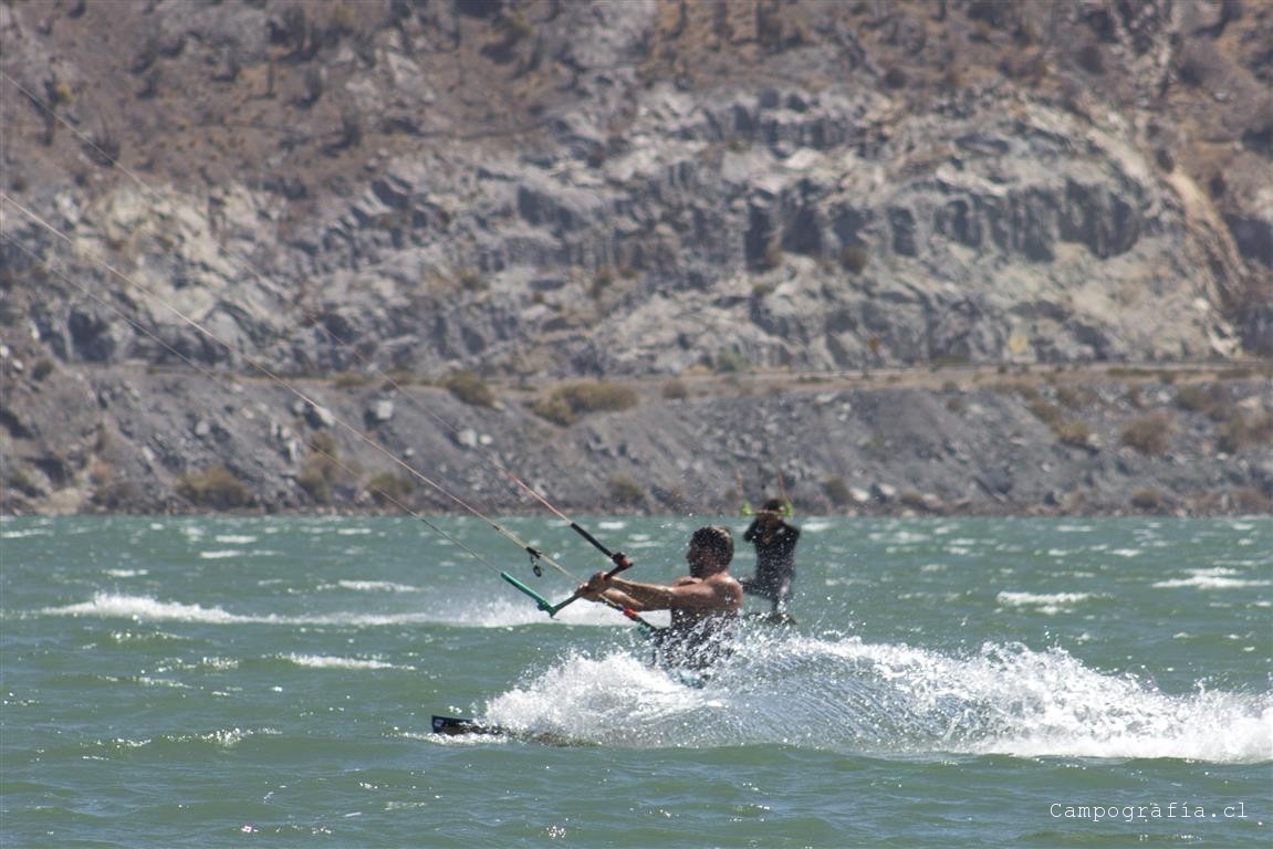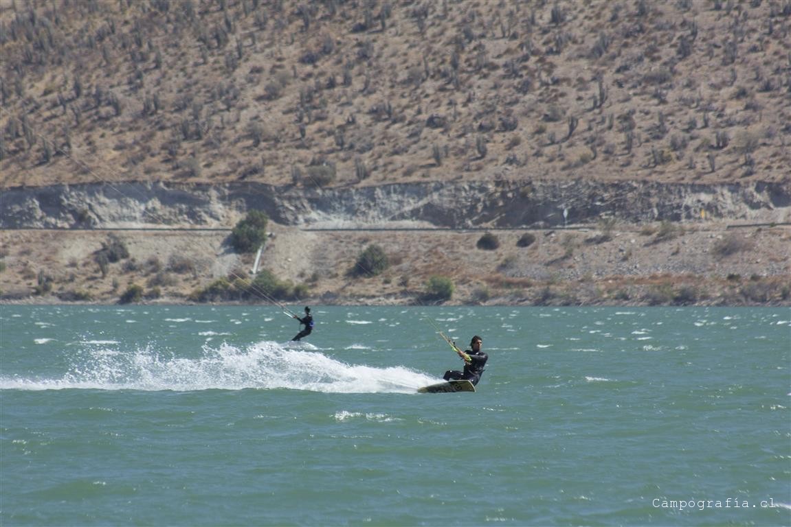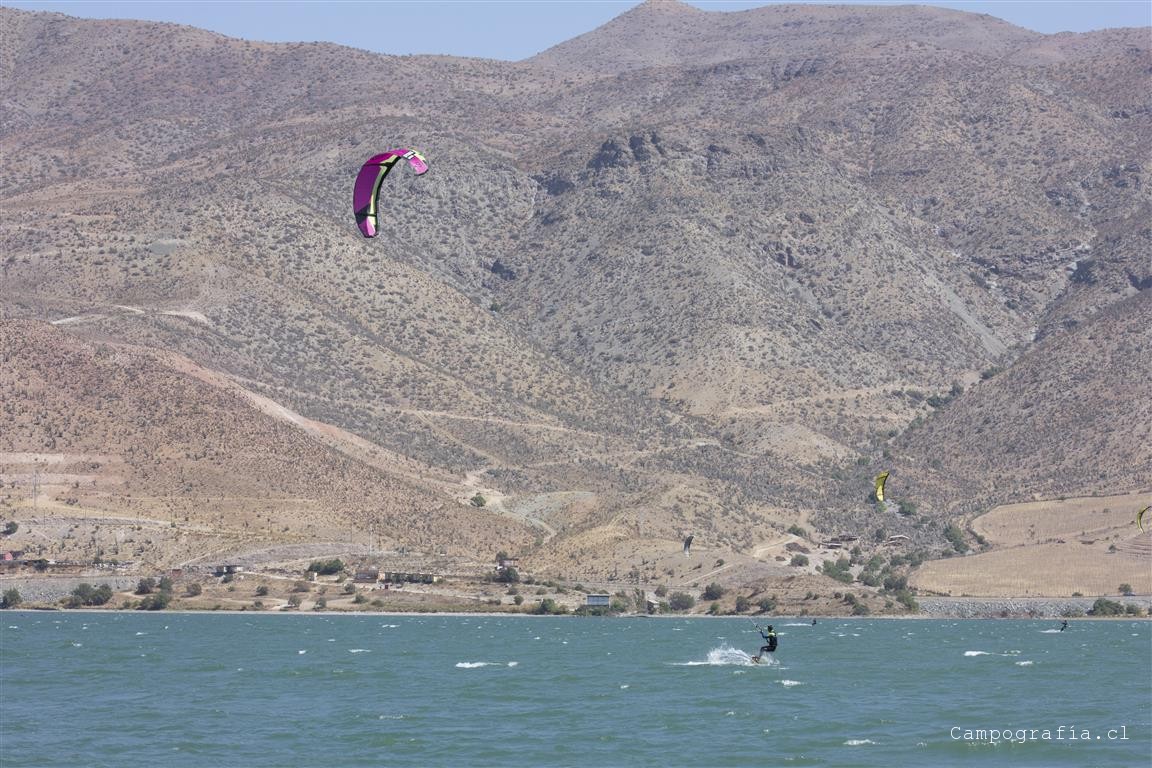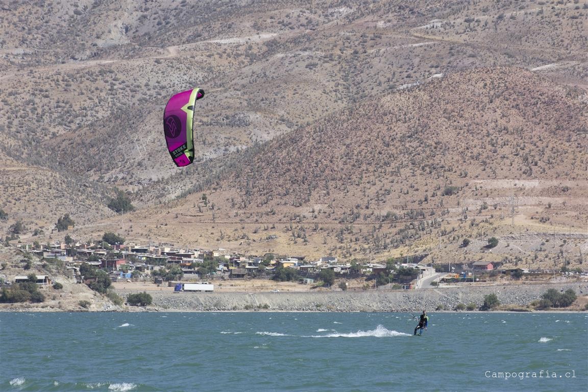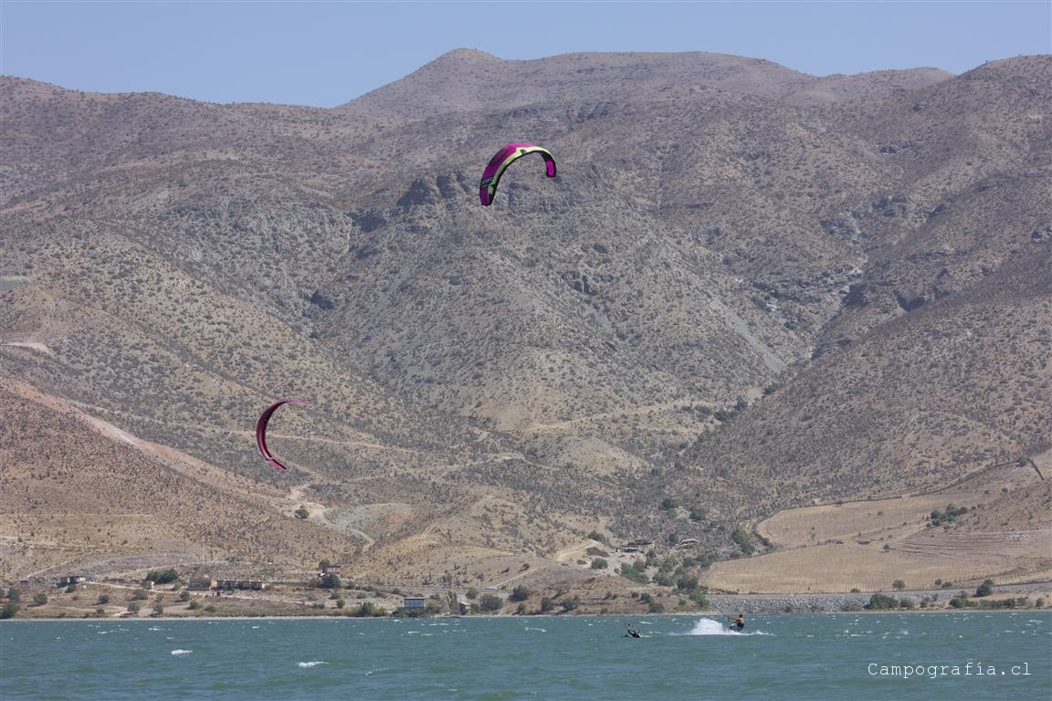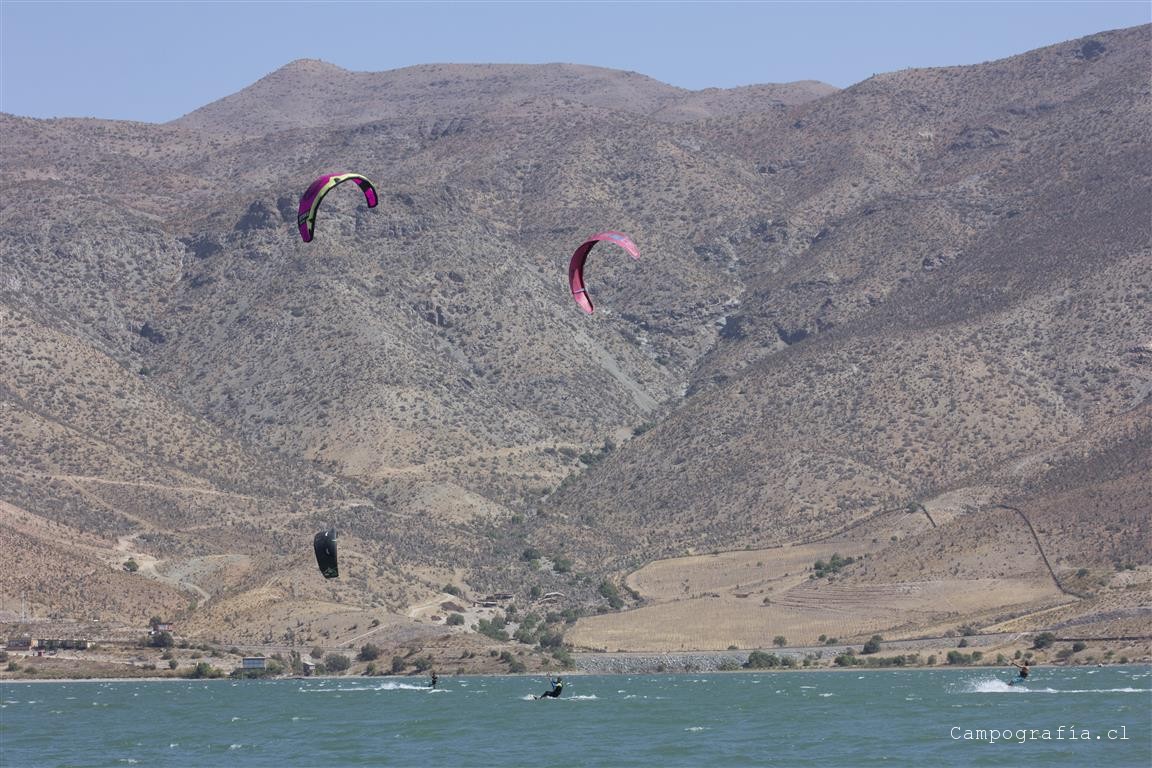 Dia lunes, hora de almuerzo, y en el embalse Puclaro muchos deportistas aprovechaban los vientos y el nivel del agua para practicar kitesurf. Unos recien saliendo de la orilla, y otros ya volando por el valle de Elqui.