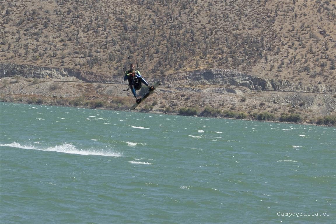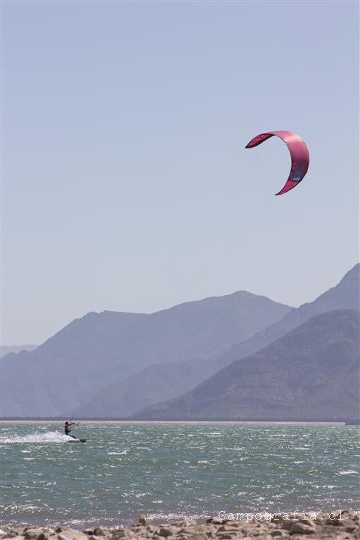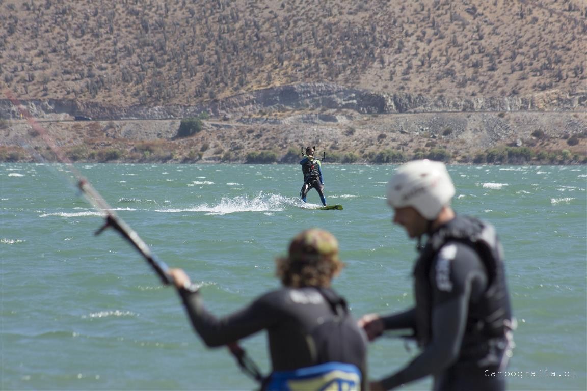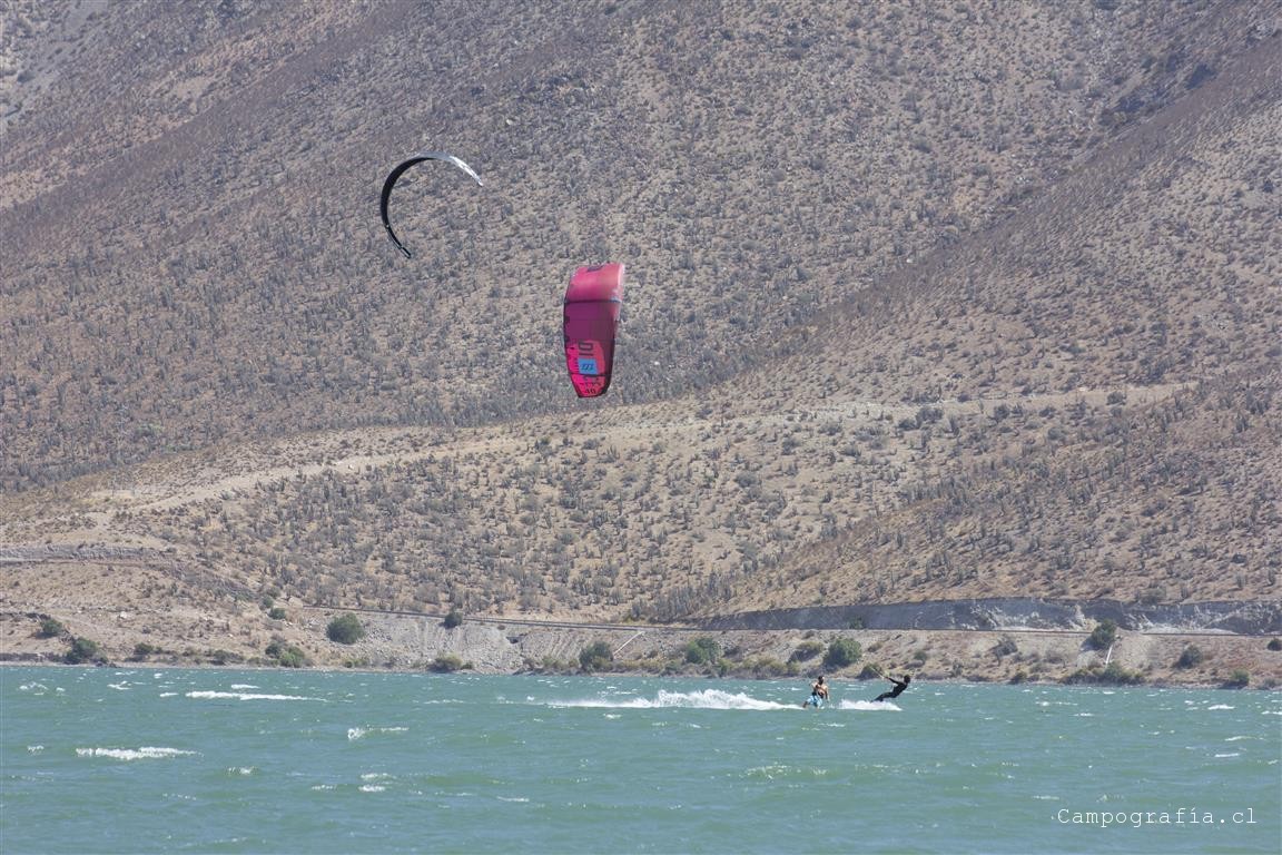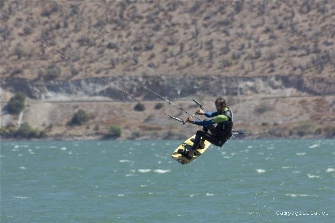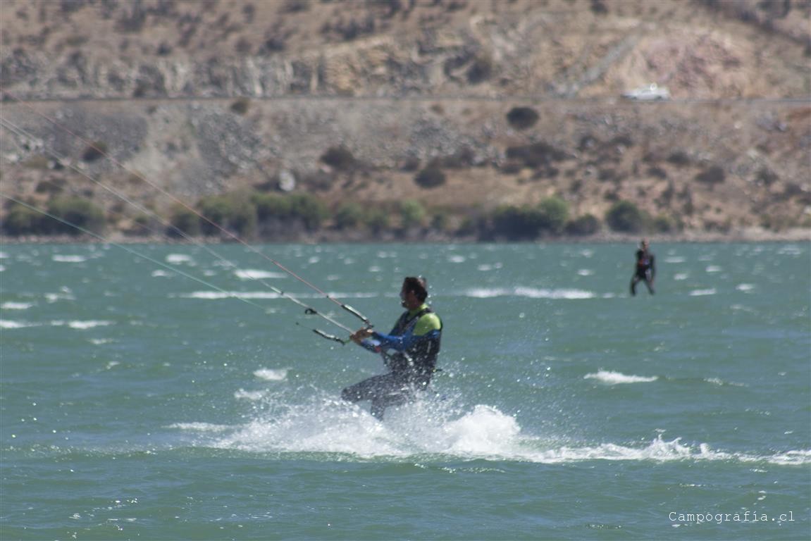 Dia lunes, hora de almuerzo, y en el embalse Puclaro muchos deportistas aprovechaban los vientos y el nivel del agua para practicar kitesurf. Unos recien saliendo de la orilla, y otros ya volando por el valle de Elqui.