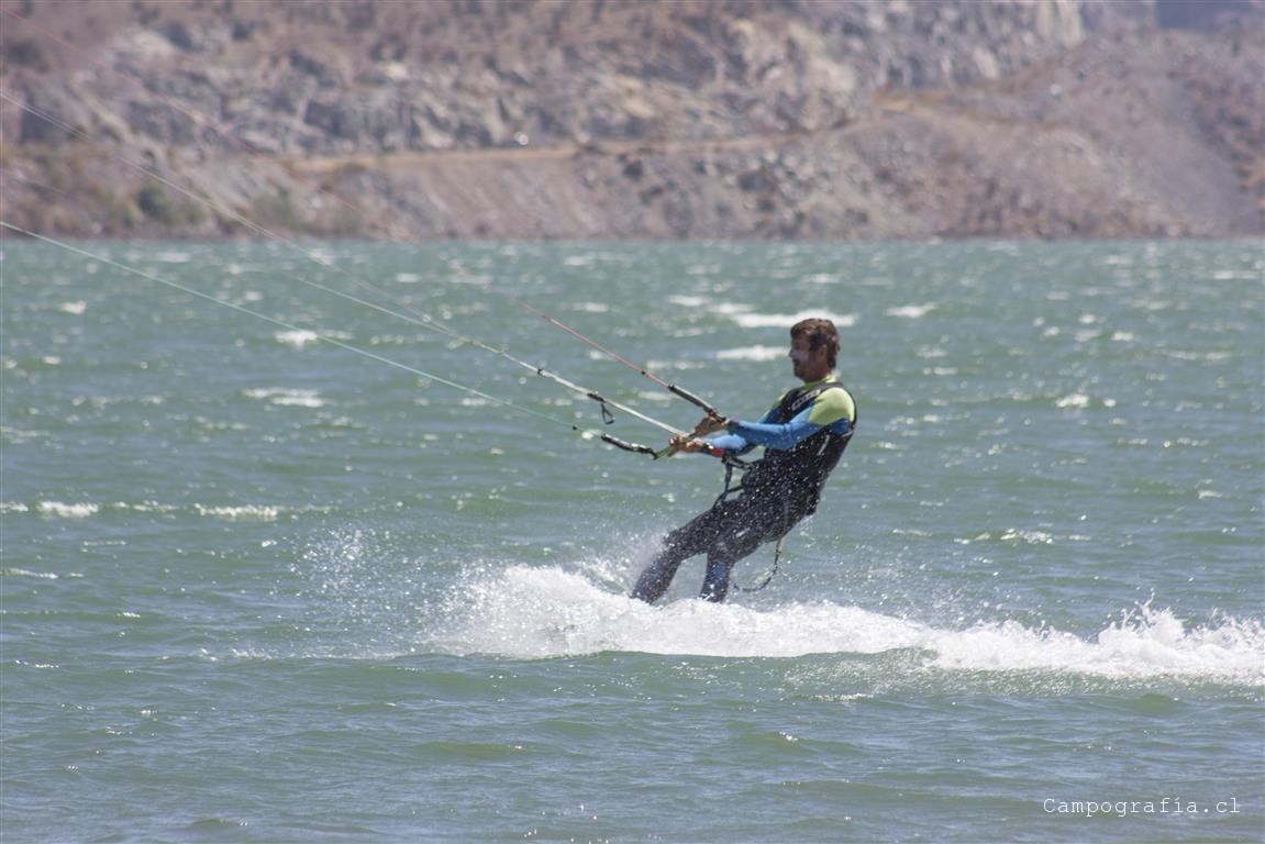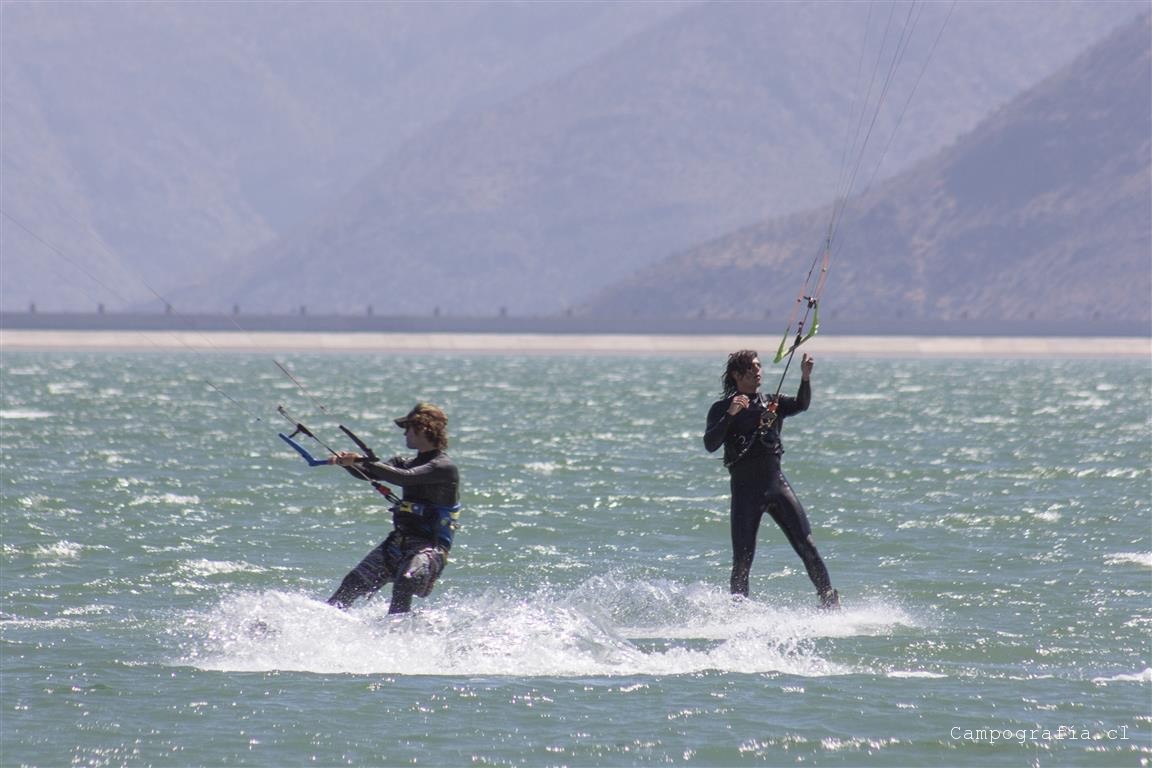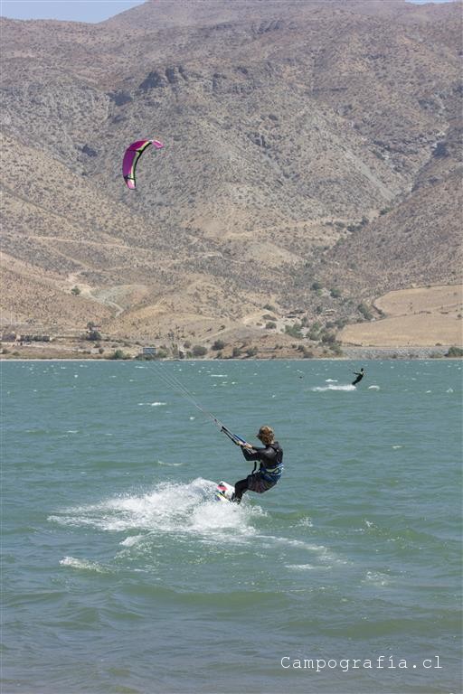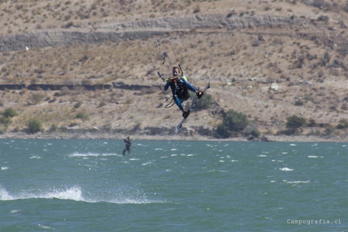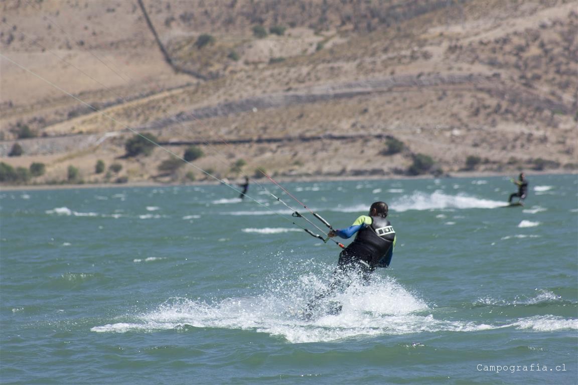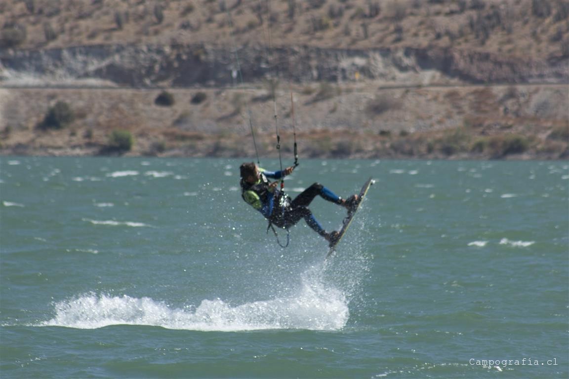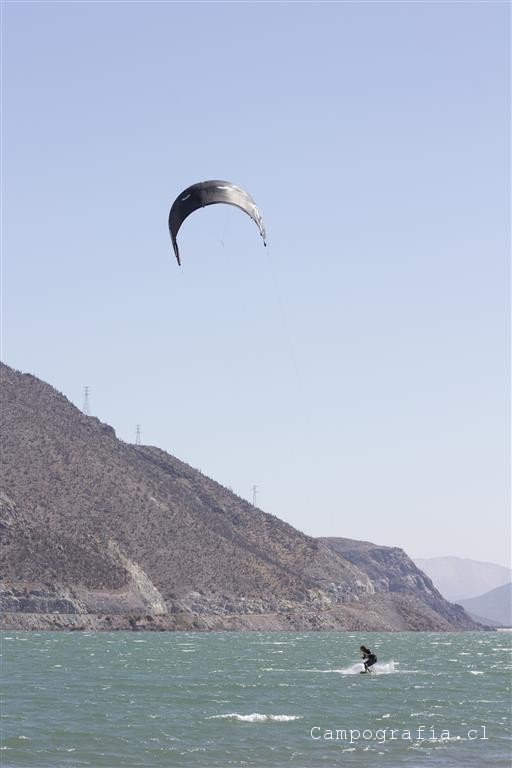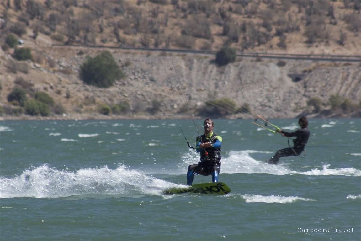 Dia lunes, hora de almuerzo, y en el embalse Puclaro muchos deportistas aprovechaban los vientos y el nivel del agua para practicar kitesurf. Unos recien saliendo de la orilla, y otros ya volando por el valle de Elqui.