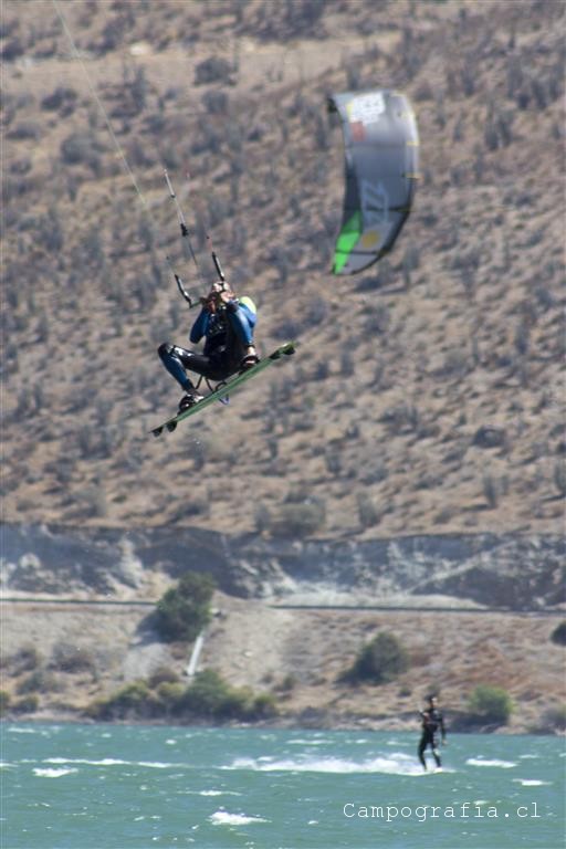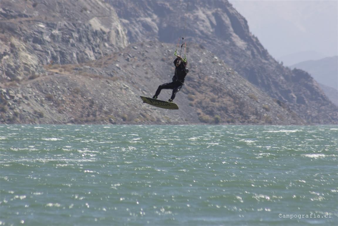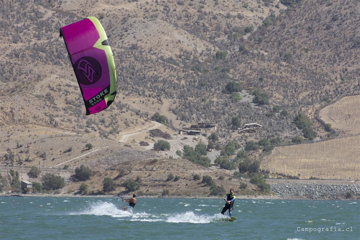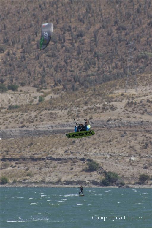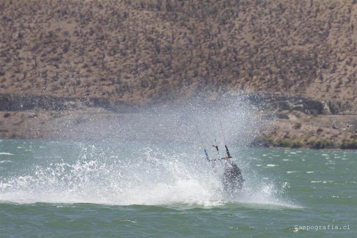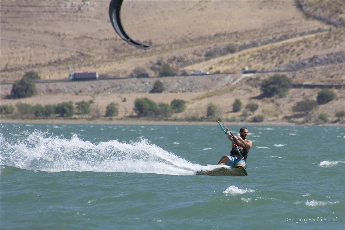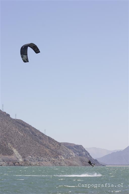 Dia lunes, hora de almuerzo, y en el embalse Puclaro muchos deportistas aprovechaban los vientos y el nivel del agua para practicar kitesurf. Unos recien saliendo de la orilla, y otros ya volando por el valle de Elqui.
