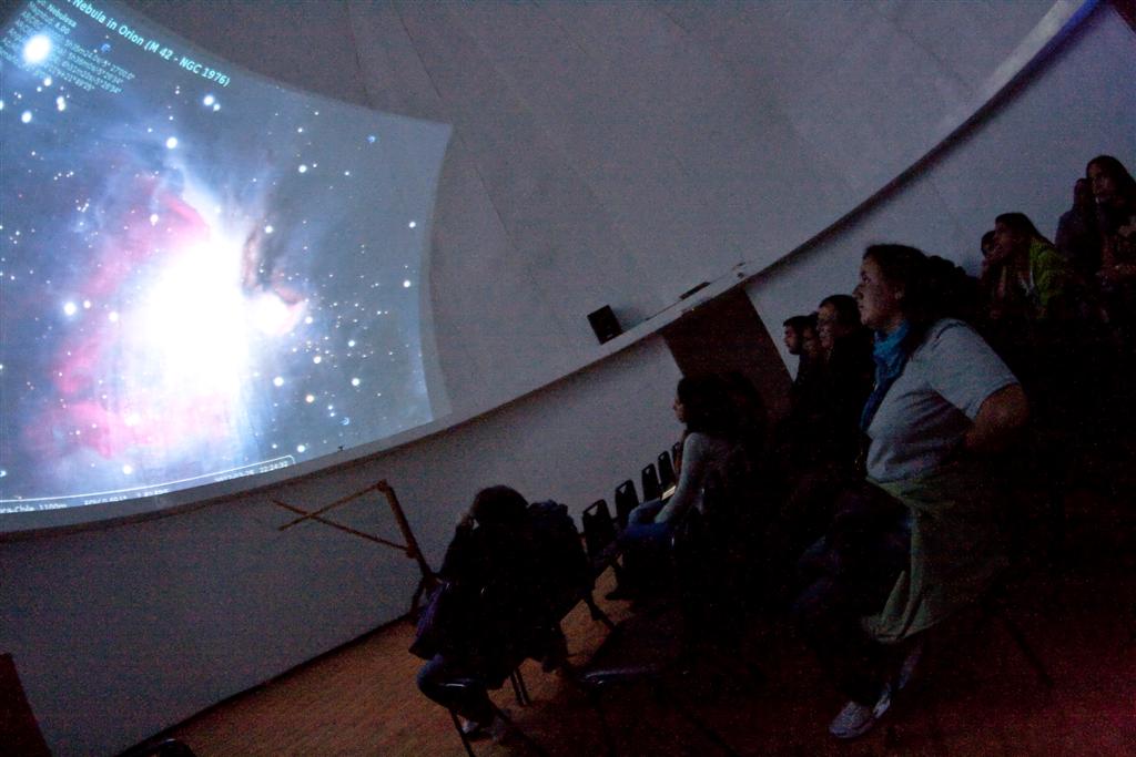 Comienzan en una sala con proyección en el cielo, con el programa Stellarium, explicando las cosas visibles y no tan visibles del cielo nocturno. Despues en la terraza se hace uso de unos telescopios para observar lo hablado anteriormente, utilizando punteros laser verde.